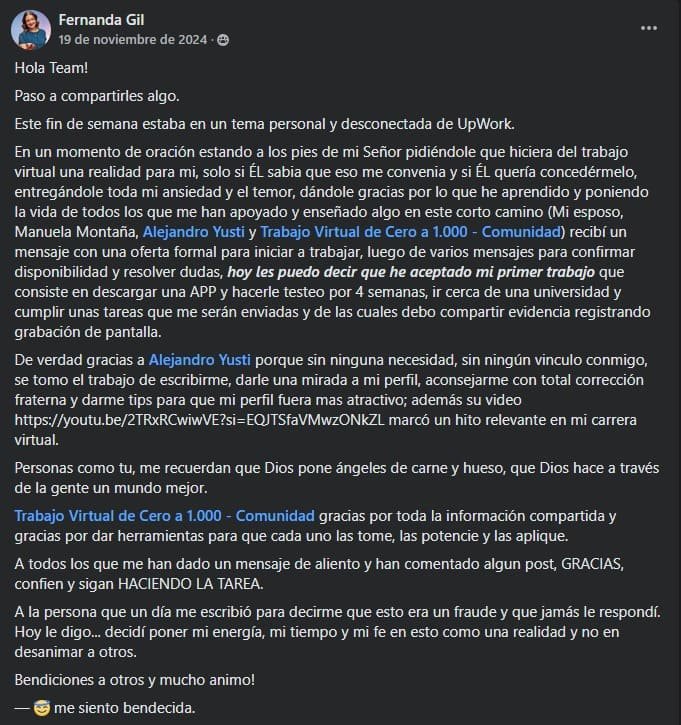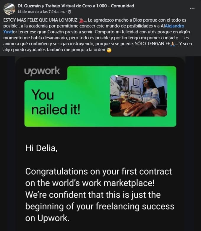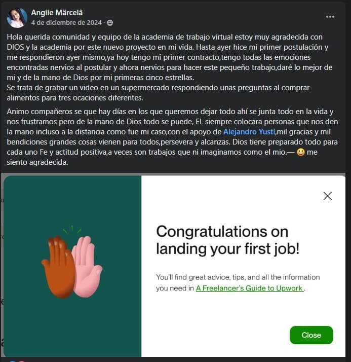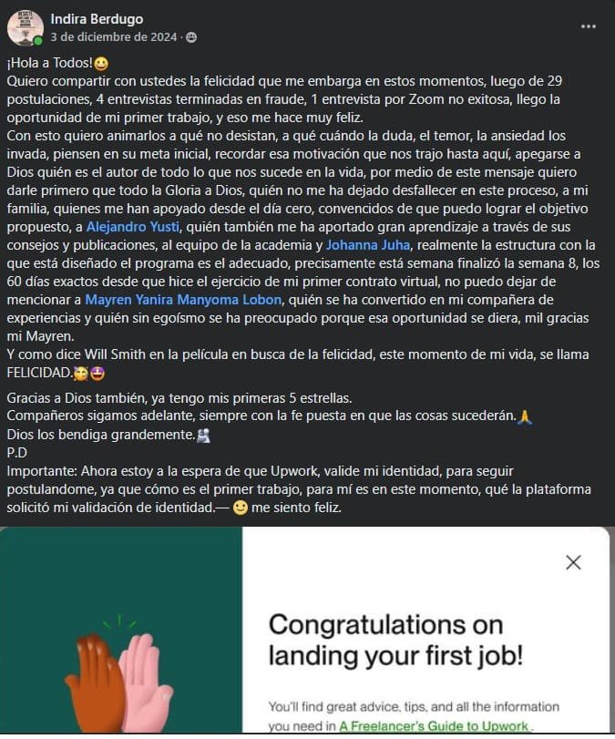 Te acompañaré personalmente para optimizar tu perfil, redactar propuestas irresistibles y conseguir tu primer cliente con 5 estrellas. No más adivinar. Tendrás claridad, enfoque y resultados reales.